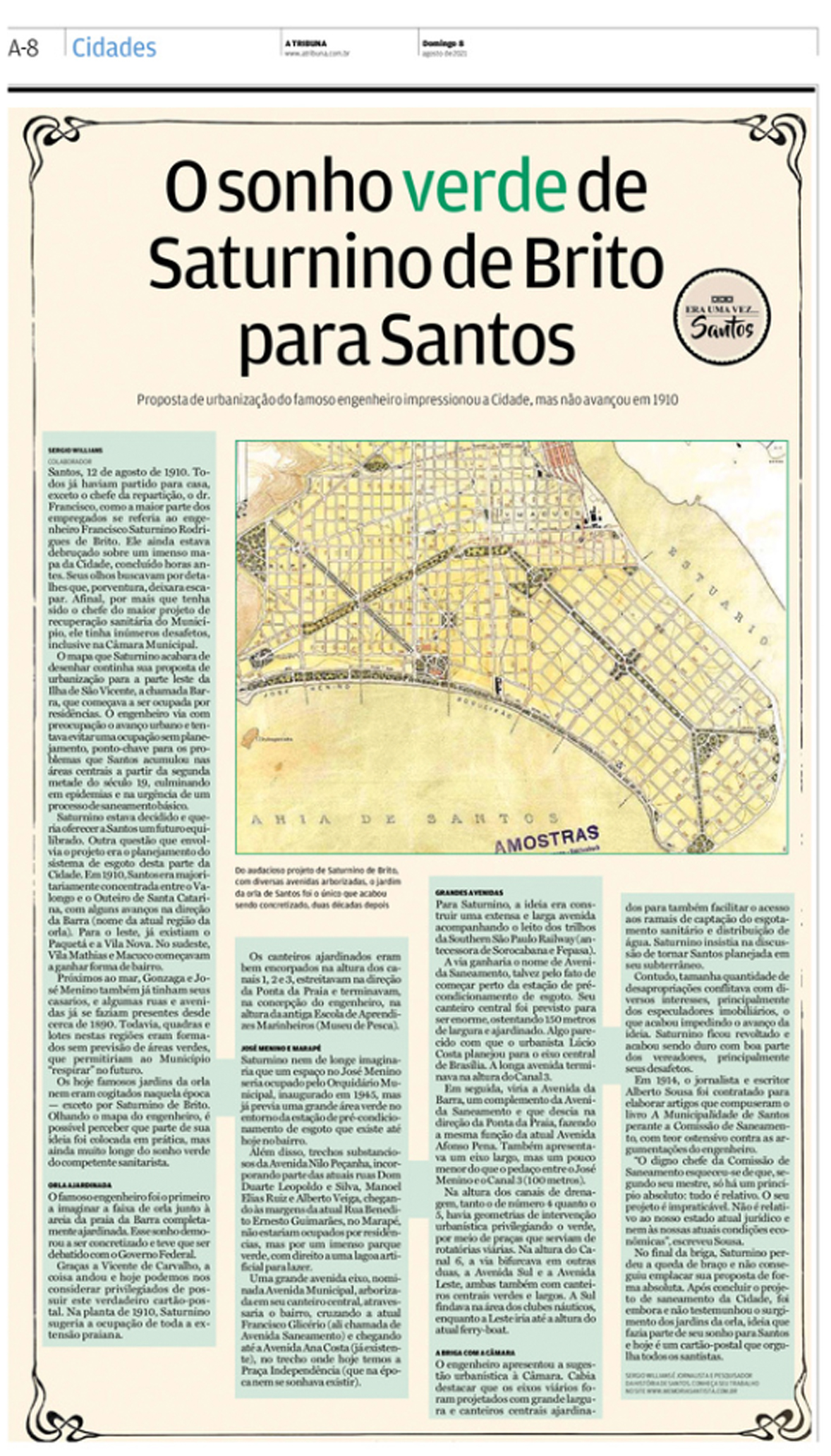 EDIÇÃO DE 08 de AGOSTO de 2021Sergio Willians abordou sobre as ideias do engenheiro sanitarista Francisco Saturnino Rodrigues de Brito, que deixou um grande legado em termos de urbanismo. Na época, Saturnino pensou numa Santos mais arejada e verde. |