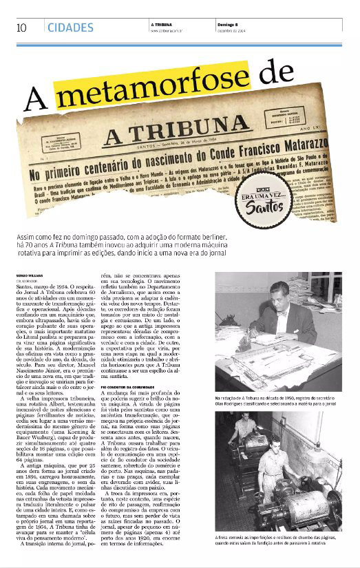 EDIÇÃO DE 8 DE DEZEMBRO DE 2024Na coluna Era Uma Vez... Santos, Sergio Willians aborda a modernização gráfica e estrutural de A Tribuna em 1954, ano em que o jornal completou seis décadas de existência. O artigo detalha a substituição da antiga rotativa “Albert” por uma moderna Koenig & Bauer Wurzburg, capaz de imprimir até 64 páginas, marcando o início de uma nova fase tecnológica e editorial. Willians destaca que a mudança representou mais do que uma atualização de maquinário: simbolizou a consolidação do jornal como referência regional em informação, mantendo o equilíbrio entre tradição e inovação. O texto ressalta o papel dos profissionais das oficinas e da redação nesse processo de adaptação, bem como a ampliação do conteúdo e das editorias, reafirmando A Tribuna como o principal elo entre Santos e sua comunidade leitora.
