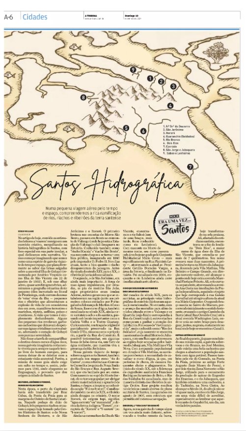 EDIÇÃO DE 10 DE NOVEMBRO DE 2024Na coluna Era Uma Vez... Santos, Sergio Willians apresenta um panorama detalhado da formação hidrográfica da cidade de Santos, com foco na porção insular. O artigo descreve a evolução dos principais rios, riachos e ribeirões que marcaram a história local, desde os tempos da antiga Ilha de Gohayó até o desenvolvimento urbano moderno. A publicação destaca os cursos d’água que atravessavam o antigo Centro — como os rios do Desterro, São Jerônimo e Itororó —, além de outros afluentes relevantes, como o Saboó, o Rio dos Soldados (que deu origem ao primeiro canal de Saturnino de Brito) e o extinto Dois Rios, que desaguava na atual região do Canal 3. O texto também menciona outros rios e cachoeiras localizados nas áreas do José Menino, Ponta da Praia e Zona Noroeste, compondo um levantamento histórico que evidencia como o desenvolvimento urbano transformou a paisagem natural da ilha. |
