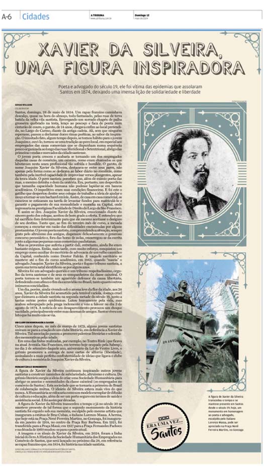 EDIÇÃO DE 12 DE MAIO DE 2024No artigo "Xavier da Silveira, uma figura inspiradora", Sergio Willians narra a trajetória do poeta e advogado Joaquim Xavier da Silveira, uma personalidade marcante de Santos no século XIX. Vítima das epidemias que assolaram a cidade em 1874, Xavier da Silveira deixou um legado de solidariedade e luta pela liberdade, sendo homenageado com a criação de um clube literário e a fundação da Sociedade Humanitária. Seu nome e seus ideais permanecem vivos na memória santista, inspirando gerações e recebendo honras como o monumento em sua homenagem. |