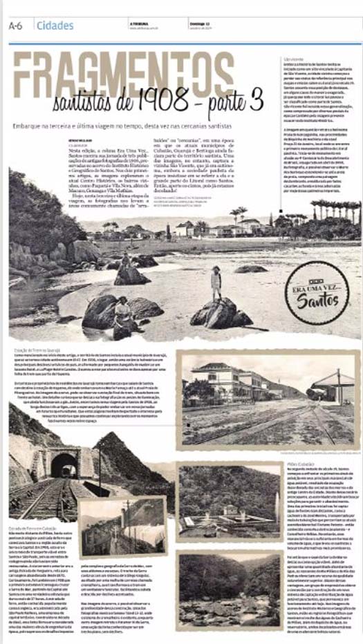 EDIÇÃO DE 13 DE OUTUBRO DE 2024Na última parte da série “Fragmentos santistas de 1908,” a coluna "Era Uma Vez... Santos" nos leva a uma viagem por fotografias raras do acervo do Instituto Histórico e Geográfico de Santos, capturando cenários de arrabaldes e cercanias de Santos. Entre os destaques, estão as fontes de água de Pilões e a estrada de ferro da São Paulo Railway, única ligação entre Santos e São Paulo na época. A coluna também nos conduz pela icônica praia do Gonzaguinha, em São Vicente, e pela estação de trem no Guarujá, ambos então partes do território santista. Com um olhar histórico e nostálgico, a série encerra com uma celebração da rica memória da região, despertando o desejo de novas explorações da história local. |