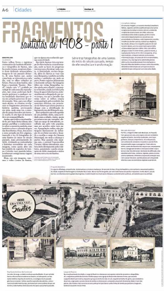 EDIÇÃO DE 15 DE SETEMBRO DE 2024No artigo Fragmentos Santistas de 1908 (I), Sérgio Willians nos conduz a uma Santos em plena transformação, revelada por 18 fotografias que documentam o início do século XX. O autor destaca o progresso da cidade com a chegada da eletricidade, a eleição do primeiro prefeito, e a construção da Praça da República, contrastando com a perda irreparável da antiga Matriz barroca. Locais icônicos, como o Largo do Rosário e o Mercado Municipal de Paquetá, aparecem como centros de intensa atividade, enquanto a avenida Conselheiro Nébias reflete a ascensão da elite local. |