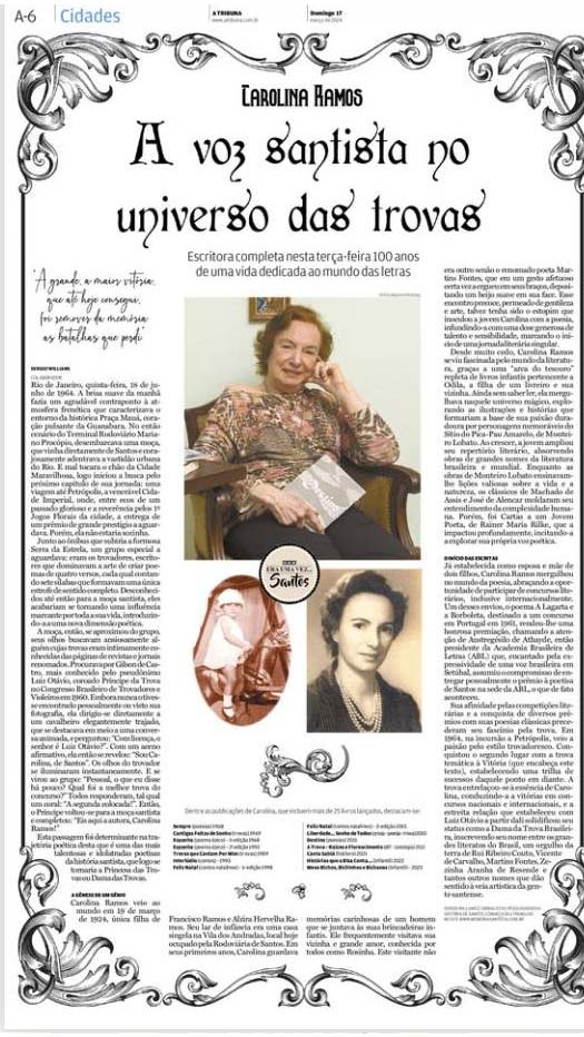 EDIÇÃO DE 17 DE MARÇO DE 2024No artigo "Carolina Ramos – A voz santista no Universo das Trovas", Sergio Willians conta a trajetória inspiradora de Carolina Ramos, uma das maiores poetisas de Santos. Desde seu encontro com o renomado trovador Luiz Otávio até sua consagração como a “Dama da Trova Brasileira”, Carolina construiu um legado literário admirável, destacando-se nacional e internacionalmente no cenário poético. Sua paixão pela poesia e pelas trovas a colocou entre os grandes nomes da literatura brasileira, eternizando seu papel na história cultural de Santos. |