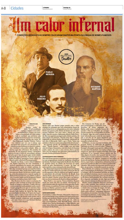 EDIÇÃO DE 18 DE FEVEREIRO DE 2024No artigo "Mas que calor infernal!", Sergio Willians narra como o intenso calor de Santos, agravado por suas condições geográficas, tornou-se um tema recorrente nas reclamações de figuras ilustres ao longo dos séculos. Desde o explorador Sir Richard Burton até o poeta Pablo Neruda, passando por D. Pedro II, muitos descreveram a cidade como uma verdadeira fornalha, deixando claro que o calor santista é, de fato, para os fortes. |