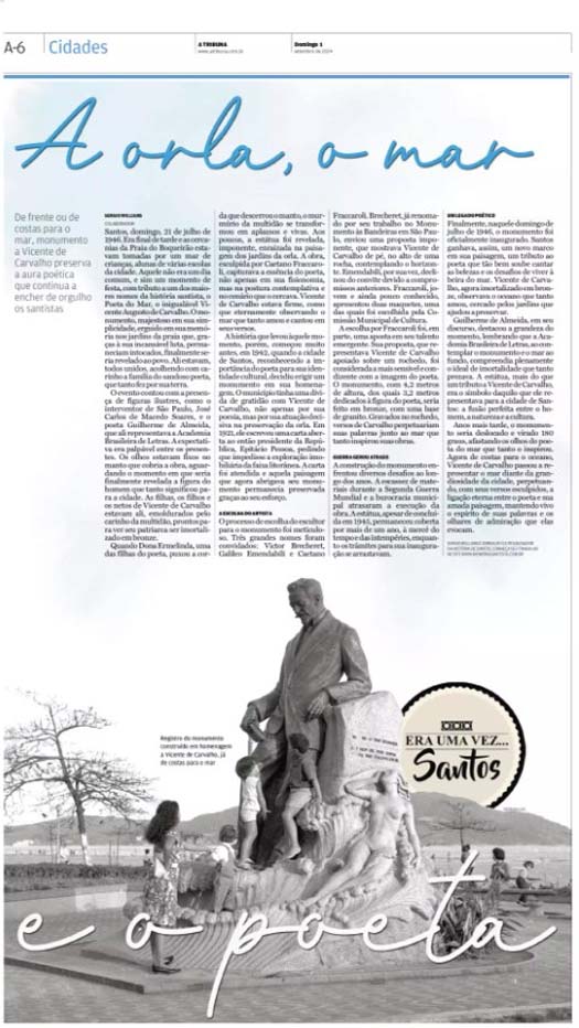 EDIÇÃO DE 1 DE SETEMBRO DE 2024No artigo "A orla, o mar e o poeta", Sergio Willians celebra a história do monumento a Vicente de Carvalho, inaugurado em 21 de julho de 1946 nos jardins da praia do Boqueirão, Santos. A obra, esculpida por Caetano Fraccaroli, homenageia o "Poeta do Mar", eternizando sua luta pela preservação da orla e sua conexão com o oceano. O evento contou com a presença de ilustres figuras e a família do poeta, marcando um tributo à sua poesia e legado. Anos depois, o monumento foi reposicionado, virando de costas para o mar, mas mantendo viva a relação do poeta com a cidade e a paisagem que tanto o inspirou. |