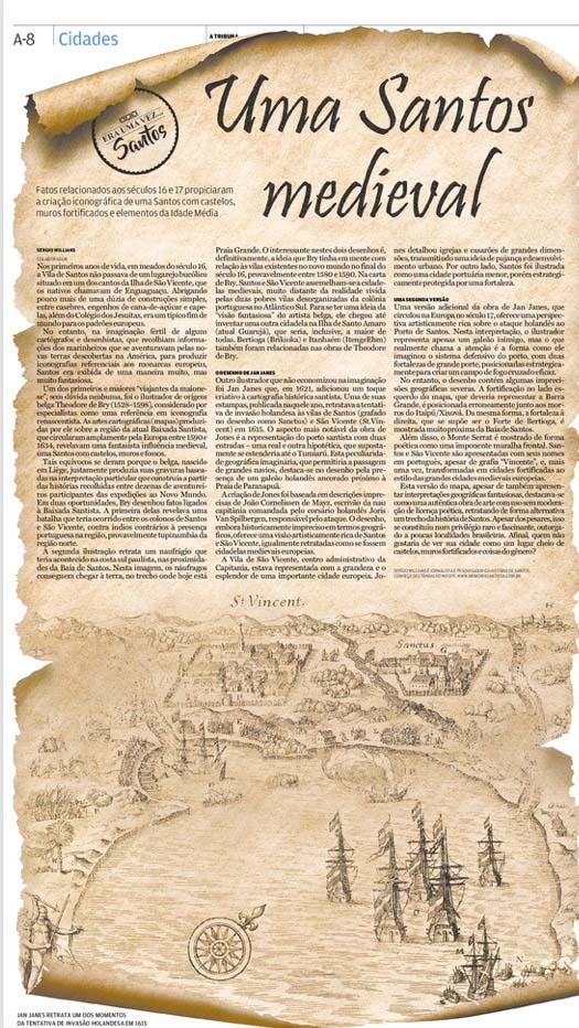 EDIÇÃO DE 21 DE JANEIRO DE 2024No artigo "Uma Santos Medieval", o jornalista Sergio Willians explora como ilustradores dos séculos XVI e XVII retrataram Santos como uma cidade medieval, com castelos e muralhas, muito distante da realidade da época. Essas interpretações fantasiosas revelam a influência da imaginação europeia sobre as representações do Novo Mundo. |