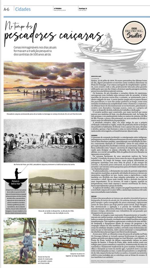 EDIÇÃO DE 21 DE JULHO DE 2024No artigo "No tempo dos pescadores caiçaras", Sergio Willians nos leva de volta a uma Santos de 100 anos atrás, quando a pesca artesanal dominava a orla da cidade. A vida dos pescadores caiçaras, descendentes de indígenas, portugueses e africanos, era marcada pela simplicidade e pela harmonia com a natureza. As vibrantes cenas de pescas de arrastão eram não só um meio de subsistência, mas também um símbolo cultural, capturado em cartões postais que eternizaram essa tradição. Hoje, resta apenas a memória dessa era romântica, onde o mar era o palco principal da vida santista. |