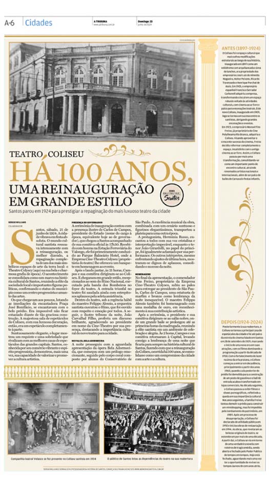 EDIÇÃO DE 23 DE JUNHO DE 2024No artigo "Santos celebra reinauguração histórica do Theatro Colysey em grande estilo", Sergio Willians relembra o grandioso evento de 21 de junho de 1924, quando a cidade festejou a reinauguração do Colyseu, o mais luxuoso teatro da cidade. A ocasião contou com a presença de figuras ilustres, como o governador Carlos de Campos, e a apresentação da ópera "Bela Adormecida", que encantou a elite santista. O teatro, ao longo dos anos, passou por inúmeras transformações, mantendo-se como um marco cultural de Santos, apesar de suas várias fases de decadência e restauração. |