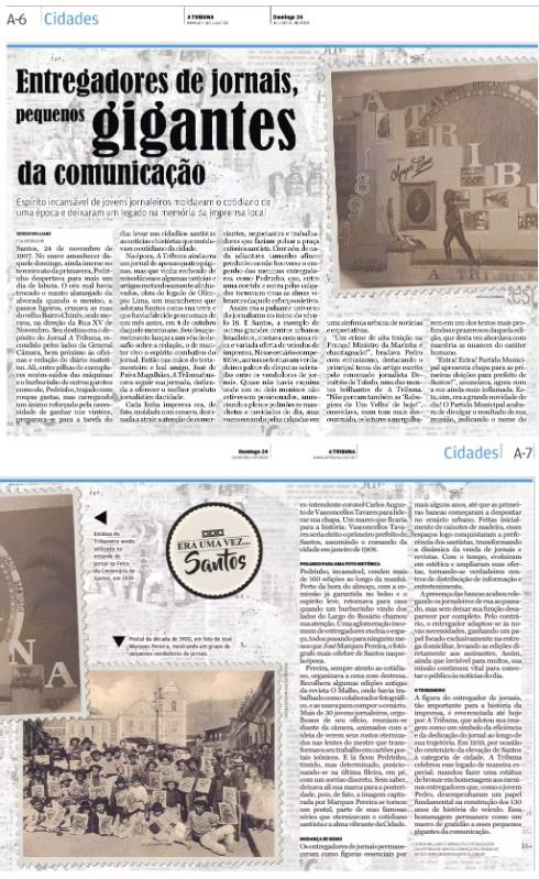 EDIÇÃO DE 24 DE NOVEMBRO DE 2024Na coluna Era Uma Vez... Santos, Sergio Willians resgata a história dos entregadores de jornais, jovens que, nas primeiras décadas do século XX, foram fundamentais para a difusão da informação em Santos. O texto destaca o cotidiano desses meninos, como o personagem Pedrinho, que simboliza a rotina de tantos jornaleiros responsáveis por levar A Tribuna às ruas da cidade. Willians relembra também o registro feito pelo fotógrafo José Marques Pereira, que eternizou um grupo de entregadores em um postal histórico, e aborda a transformação da profissão com o surgimento das primeiras bancas. O artigo conclui mencionando a homenagem prestada por A Tribuna em 1939, quando o jornal inaugurou a estátua O Tribuneiro, marco simbólico da dedicação e do legado desses pequenos gigantes da comunicação santista. |