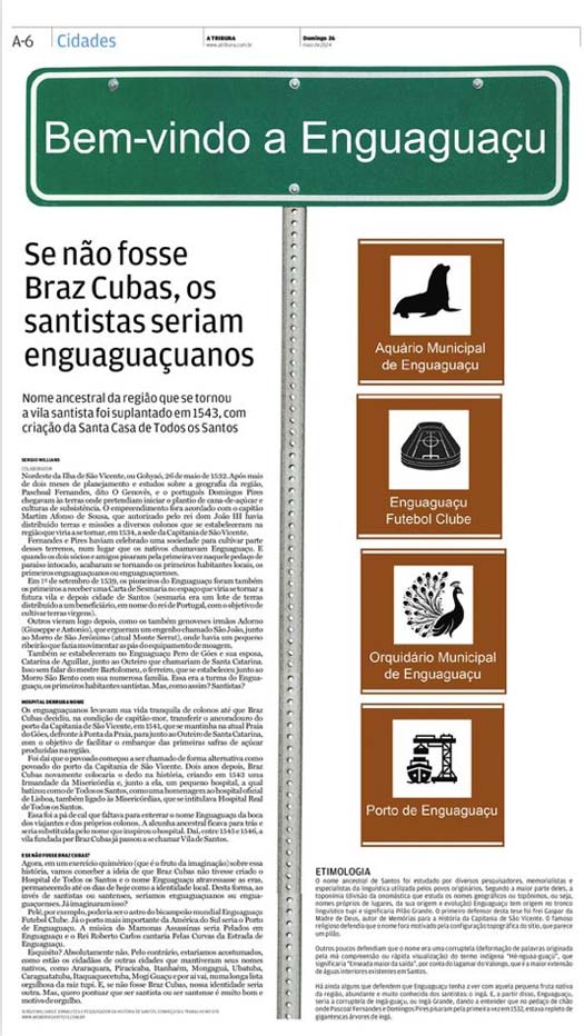 EDIÇÃO DE 26 DE MAIO DE 2024No artigo "Se não fosse Braz Cubas, seríamos todos Enguaguaçuanos", Sergio Willians nos transporta para o passado, quando o nome de Santos ainda era Enguaguaçu. Ele narra como a decisão de Braz Cubas de fundar o hospital de "Todos os Santos" na região mudou a identidade da cidade. Willians propõe um exercício de imaginação, refletindo como a cidade e seus habitantes seriam chamados caso o nome indígena tivesse prevalecido. Com humor e erudição, o autor explora a etimologia de Enguaguaçu e destaca como a história moldou a identidade santista. |
