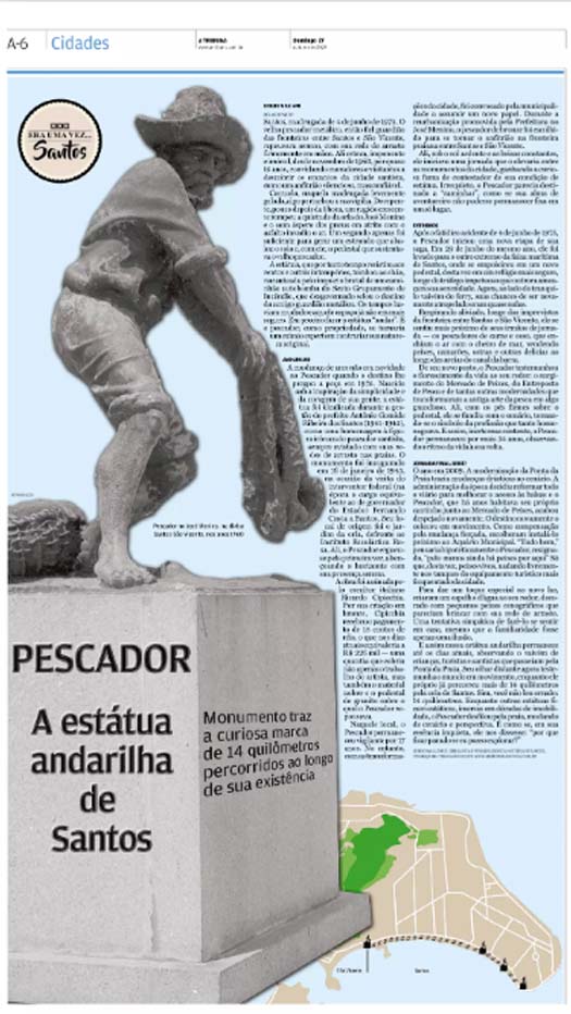EDIÇÃO DE 27 DE OUTUBRO DE 2024Em sua coluna “Era Uma Vez...Santos,” Sergio Willians revela a intrigante trajetória da estátua do Pescador, um monumento singular que, ao longo de décadas, percorreu mais de 14 quilômetros pela orla santista. Criada em 1943 pelo escultor Ricardo Cipicchia, a estátua foi homenageada à figura do pescador santista e inicialmente instalada diante do Instituto Escholástica Rosa. Após um acidente em 1975, que a retirou da fronteira entre Santos e São Vicente, a estátua ganhou novo lar na Ponta da Praia, onde se tornou símbolo da tradição pesqueira da cidade. Em 2009, uma última mudança levou-a para o Aquário Municipal, cercada por um espelho d’água. Em seu texto, Willians explora a ideia de que, enquanto outras estátuas permanecem imóveis, o Pescador, inquieto, parece destinado a explorar, refletindo a constante transformação de Santos. |