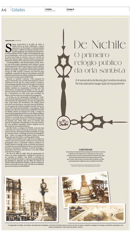 EDIÇÃO DE 28 DE ABRIL DE 2024No artigo "De Níchile, primeiro relógio público da orla praiana santista", Sergio Willians nos transporta para a inauguração do icônico relógio em 9 de julho de 1936. Instalado próximo à fonte "9 de Julho" no Gonzaga, o relógio era uma inovação tanto no design quanto no uso para propagandas, criado pelo publicitário Octávio De Níchile. Embora sua vida útil tenha sido curta devido ao ambiente marítimo, o relógio marcou uma era de modernidade e estilo na paisagem de Santos, se tornando parte da memória histórica da cidade. |