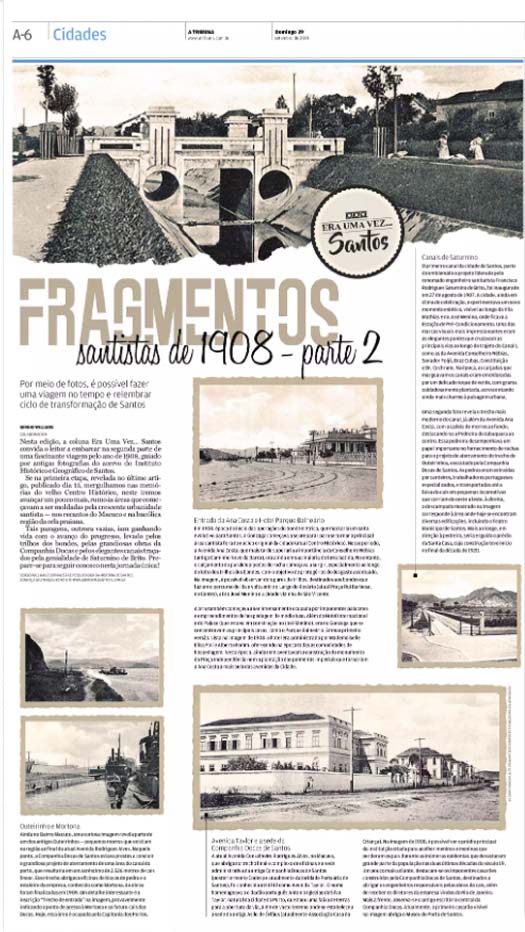 EDIÇÃO DE 29 DE SETEMBRO DE 2024Na segunda parte de Fragmentos Santistas de 1908, Sérgio Willians continua sua viagem fotográfica, explorando o crescimento urbano de Santos. Ele destaca a transformação da Avenida Taylor, atual Rodrigues Alves, que abrigava a sede da Companhia Docas de Santos e o Asilo de Órfãos. A expansão portuária, com o aterramento do Outeirinho, também ganha destaque, assim como os elegantes canais projetados por Saturnino de Brito, que deram à cidade um novo visual. Willians menciona a crescente importância da Avenida Ana Costa e o desenvolvimento do bairro do Gonzaga, marcado pela chegada do bonde elétrico e pela construção de hotéis como o Parque Balneário, que prenunciavam o futuro turístico de Santos. |