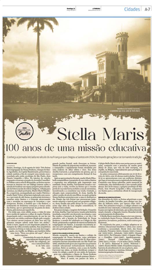 EDIÇÃO DE 31 DE MARÇO DE 2024No artigo "Stella Maris – 100 anos de uma missão educativa", Sergio Willians conta a história do Colégio Stella Maris, fundado em Santos em 1924 por freiras da Congregação de Nossa Senhora. Desde a aquisição do casarão da família Carraresi até a adaptação ao sistema educacional brasileiro, o colégio, inicialmente destinado a meninas, tornou-se uma referência educacional na cidade, formando gerações e marcando sua trajetória com excelência e tradição centenária. |