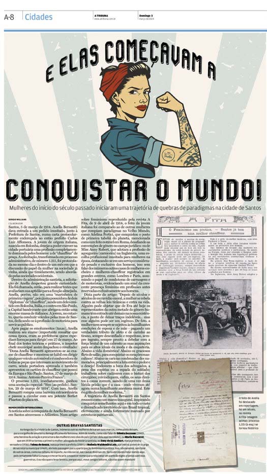 EDIÇÃO DE 03 DE MARÇO DE 2024No artigo "E elas começavam a conquistar o mundo!", Sergio Willians narra a trajetória de Anella Bersantti, uma pioneira que quebrou barreiras em Santos ao se tornar a primeira mulher chauffeur da cidade em 1914. Sua conquista foi um marco que ecoou internacionalmente, simbolizando o início de uma mudança significativa no papel das mulheres na sociedade santista e inspirando outras pioneiras em diversas áreas, desde a aviação até a política. |