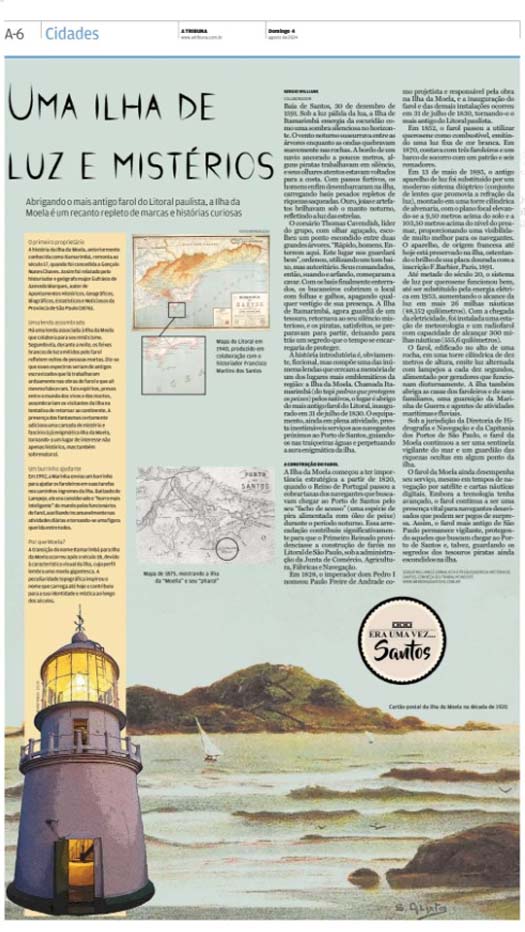 EDIÇÃO DE 4 DE AGOSTO DE 2024No artigo "Uma ilha de luz e mistérios", Sergio Willians explora a história fascinante da Ilha da Moela, que abriga o farol mais antigo do litoral paulista, inaugurado em 1830. Além de ser um marco essencial para a navegação até hoje, a ilha é envolta em lendas e histórias curiosas, como o suposto tesouro enterrado pelo pirata Thomas Cavendish e os vultos assombrados refletidos pelo farol. Com seu nome derivado da aparência que lembra uma moela gigante, a ilha é um ponto de mistério e beleza, preservando segredos do passado e protegendo os navegantes nas águas da Baía de Santos. |
