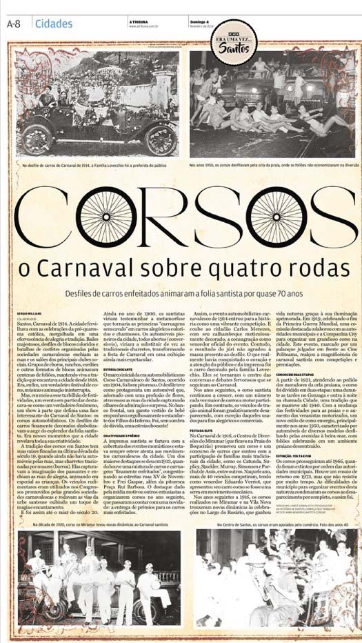 EDIÇÃO DE 4 DE fevereiro DE 2024No artigo "Corsos, o Carnaval sobre quatro rodas", Sergio Willians relembra os desfiles de carros enfeitados que marcaram o Carnaval de Santos por quase 70 anos. Desde sua origem no início do século XX até sua extinção na década de 1960, esses eventos refletiam a criatividade e o espírito festivo da cidade, transformando as ruas em um espetáculo de cores e alegria. |