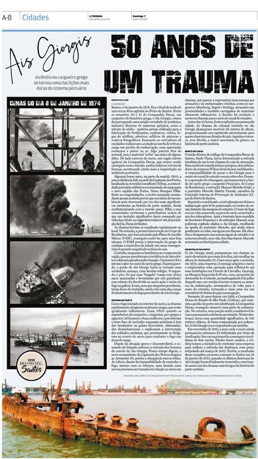 EDIÇÃO DE 7 DE JANEIRO DE 2024No artigo "Ais Giorgis - 50 Anos da Maior Tragédia do Porto de Santos", o jornalista Sergio Willians narra em detalhes o incêndio devastador no cargueiro grego, que marcou a história portuária. O episódio não só trouxe lições ao setor como também deixou cicatrizes que perduraram por décadas no canal santista. |