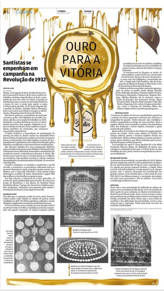 EDIÇÃO DE 7 DE JULHO DE 2024No artigo "Santistas se empenham na Campanha do 'Ouro para a Vitória' na Revolução de 1932", Sergio Willians detalha a mobilização de Santos em apoio à Revolução Constitucionalista, por meio da arrecadação de ouro e outros metais preciosos. Com doações de cidadãos, atletas e clubes esportivos, a cidade conseguiu arrecadar cerca de 60 quilos de ouro em um mês e meio, equivalente a R$ 25 milhões hoje. A campanha não só contribuiu para o esforço de guerra paulista, como também ajudou a Santa Casa de Misericórdia a construir um pavilhão para tuberculosos em Campos do Jordão, perpetuando o espírito de solidariedade da cidade. |