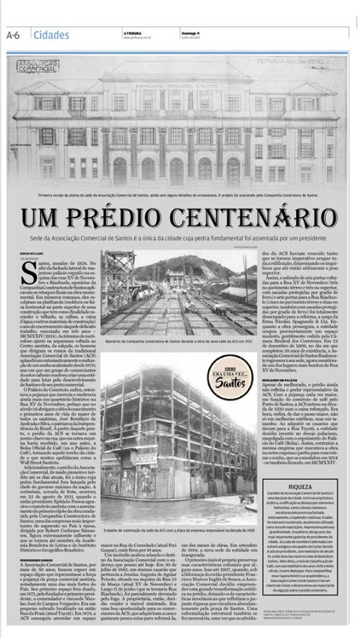 EDIÇÃO DE 9 DE JUNHO DE 2024No artigo "Um prédio centenário", Sergio Willians conta a história do icônico edifício da Associação Comercial de Santos, cuja pedra fundamental foi assentada pelo presidente Epitácio Pessoa em 1921. A construção, finalizada em 1924, reflete o crescimento da cidade e do porto santista, especialmente no comércio de café. Com uma arquitetura eclética e rica em detalhes, tanto interna quanto externamente, o prédio é um símbolo da pujança econômica e histórica de Santos, sendo reconhecido como uma das joias arquitetônicas da cidade. |
